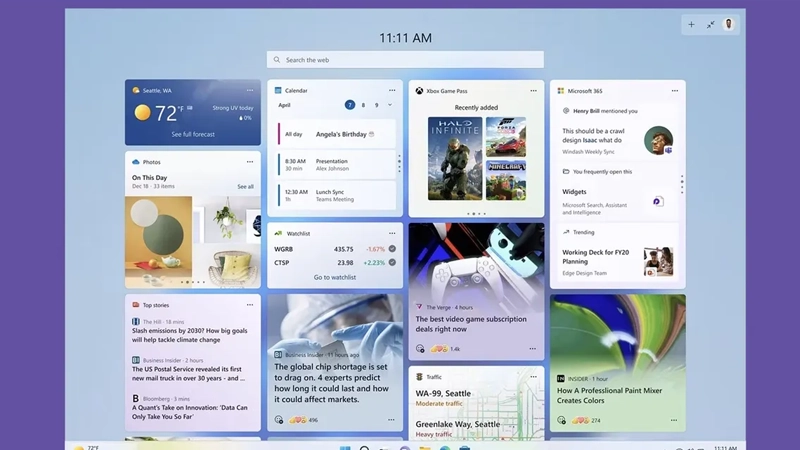 ویندوز 11 طیف گستردهای از ویجتها را در اختیار کاربران قرار میدهد که شامل ویجتهای خبری، هواشناسی، تقویم، سهام، ورزشی و موسیقی میشود.